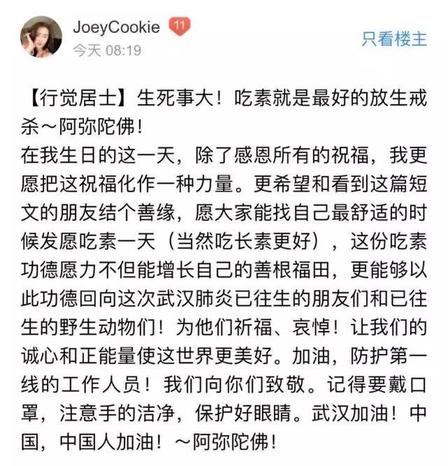 同時(shí),身為虔誠佛教徒的她,還號(hào)召自己的粉絲們吃素一天,以此來為那些不幸因新型冠狀病毒感染的肺炎而去世的同胞們和已經(jīng)往生的野生動(dòng)物們祈福、哀悼。