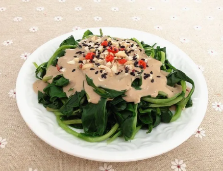 3.加適量鹽后出鍋;4.出鍋裝盤后,淋入芝麻醬拌勻,即可食用。