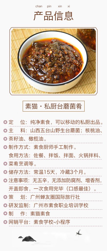 而素貓私廚在疫情期間,聯合蟬友圈國旅、廣州素食學校、素貓素食研發中心,共同參與產品策劃、研發、生產、銷售。以“真材實料、廚藝創新、手工制作”為特色,形成“可以移動的純素私廚出品”系列。