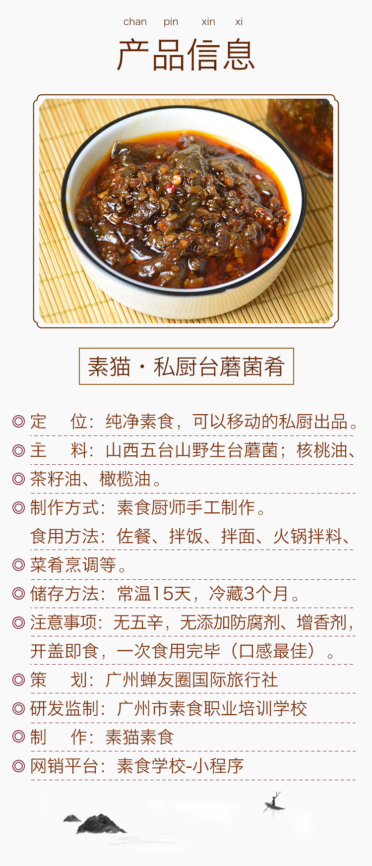 臺蘑菌肴是由吃素的素食大廚手工制作,將野生臺蘑制作而成的美味佳肴裝瓶鎖鮮,采用健康的烹調(diào)手法,還原食材本真的味道,料足味美,口味正宗,純綠色食品!,每一口都是大自然的饋贈!在用油方面,特選了來自原產(chǎn)地純野生無勾兌壓榨茶籽油、核桃油、橄欖油,無一不是精選、優(yōu)質(zhì)!否則實在難以搭配如此好的食材!