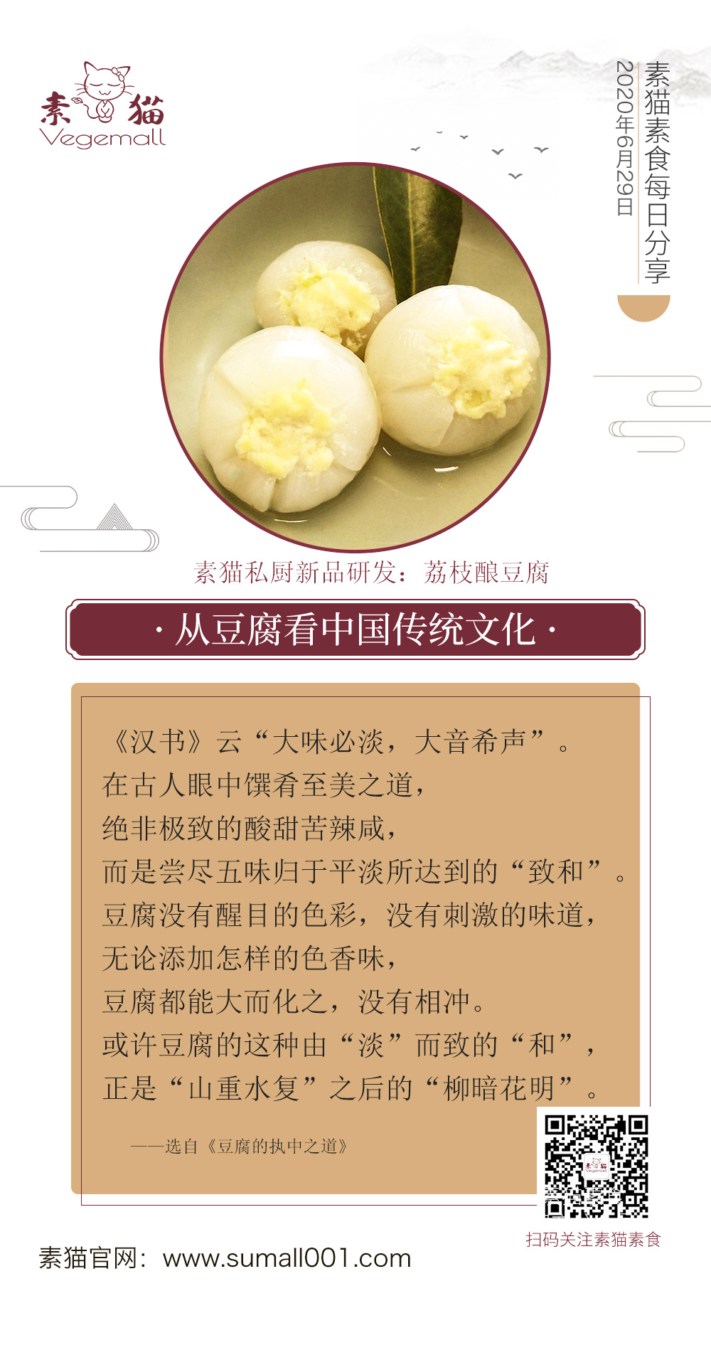 素貓·豆腐·飯,不僅僅是豆腐店,也是素食餐飲店,秉承中華素食傳統,堅持純素特色,追求食物的本真味道,以“美味、健康、不貴”的古法豆腐飯為主打,進軍白領快餐市場。并升級推出了營養早餐、美味豆小食等,以滿足各類人群的全面用餐需求。